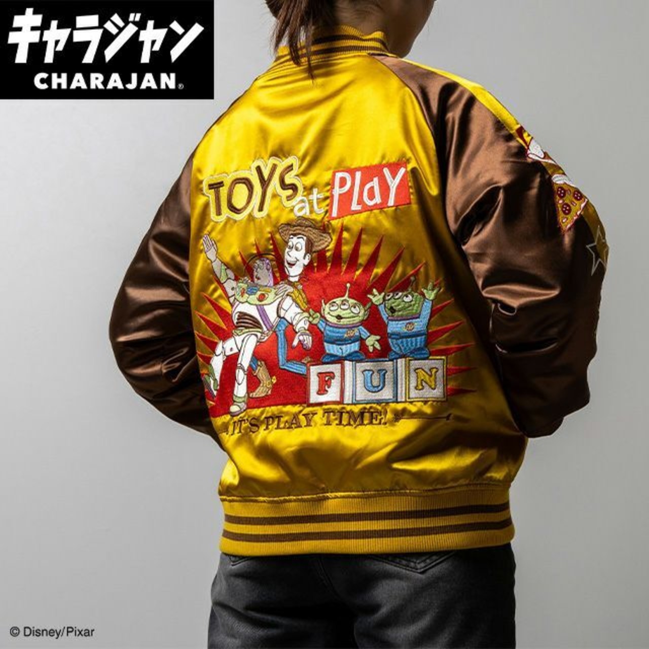 このトイストーリー トイズスペシャル スカジャンは、ディズニーの楽しい世界を見事に表現した、おしゃれで目を引く一枚です!カラフルなデザインとトイストーリーのキャラクターたちが、あなたのコーディネートに特別な魅力を加え、周囲の視線を惹きつけます。